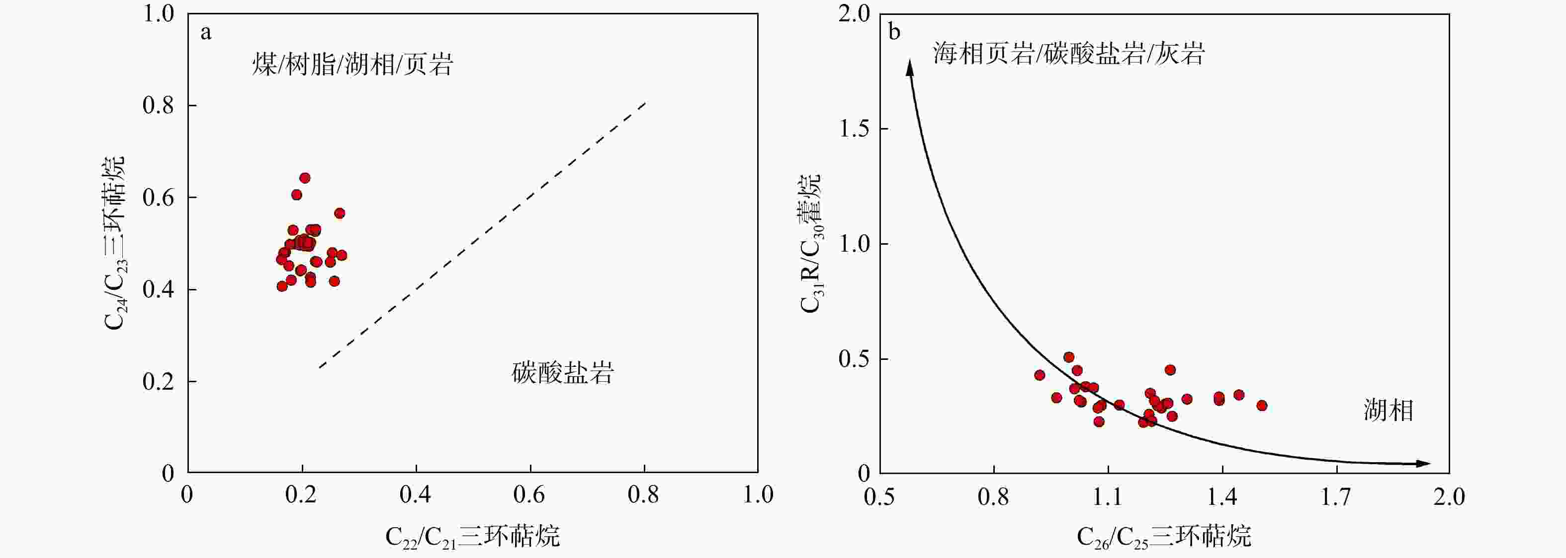 a—C22/C21三环萜烷 与 C24/C23三环萜烷交汇图;b—C26/C25三环萜烷与 C31R/C30藿烷交汇图(据Peters et al.,2007修改)