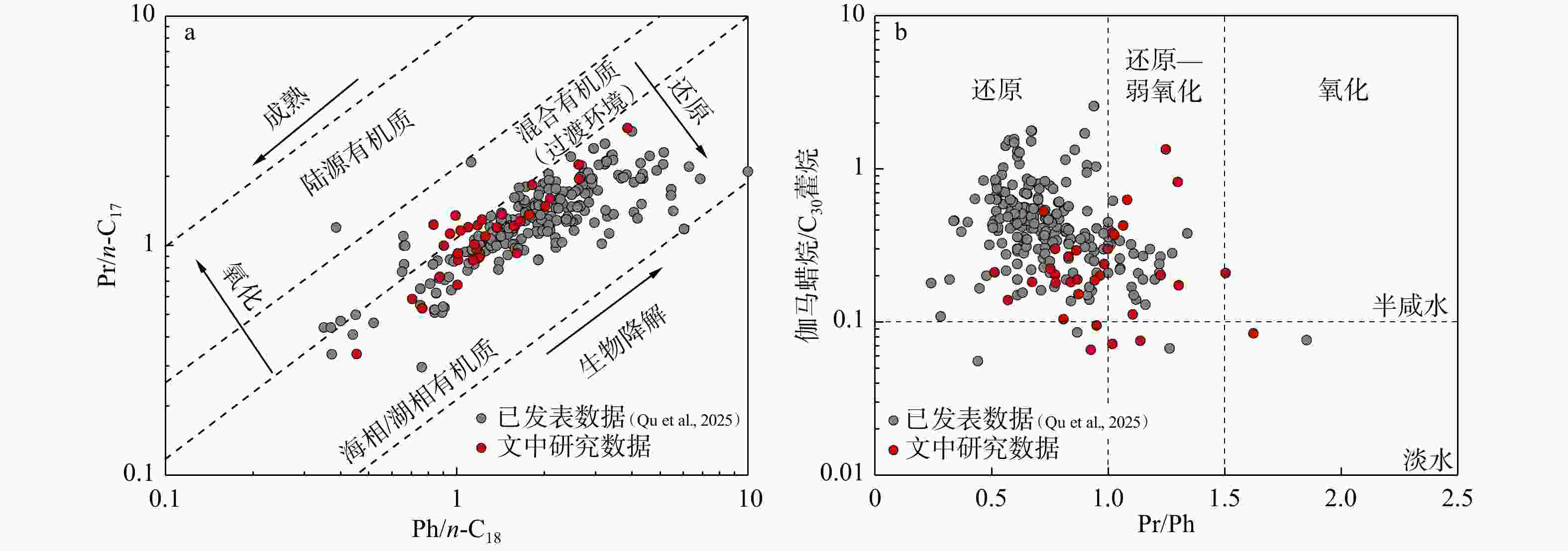 a—准噶尔盆地风城组Ph/n-C18与Pr/n-C17交汇图;b—伽马蜡烷指数与Pr/ Ph交汇图