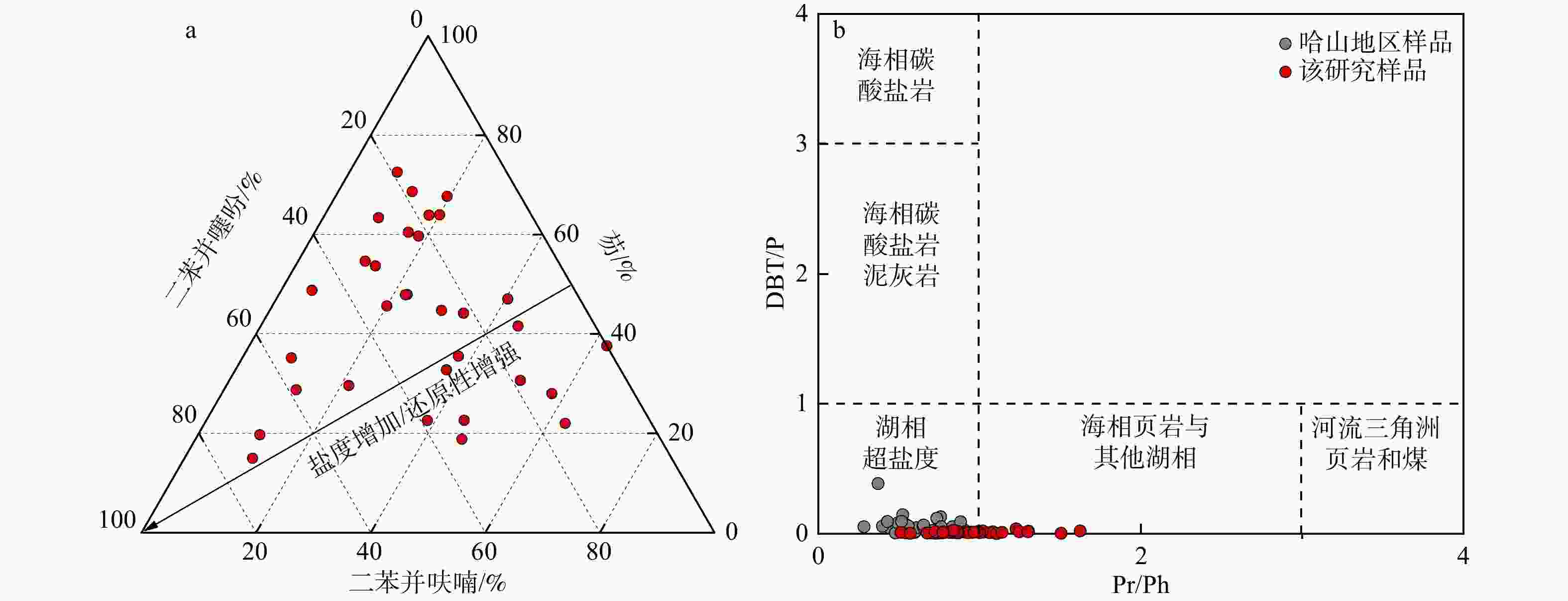 a—芴(FL)、二苯并呋喃(DBF)和二苯并噻吩(DBT)相对含量三角图;b—二苯并噻吩/菲比值(DBT/P)与姥植比(Pr/Ph)交汇图(Hughes et al.,1995)