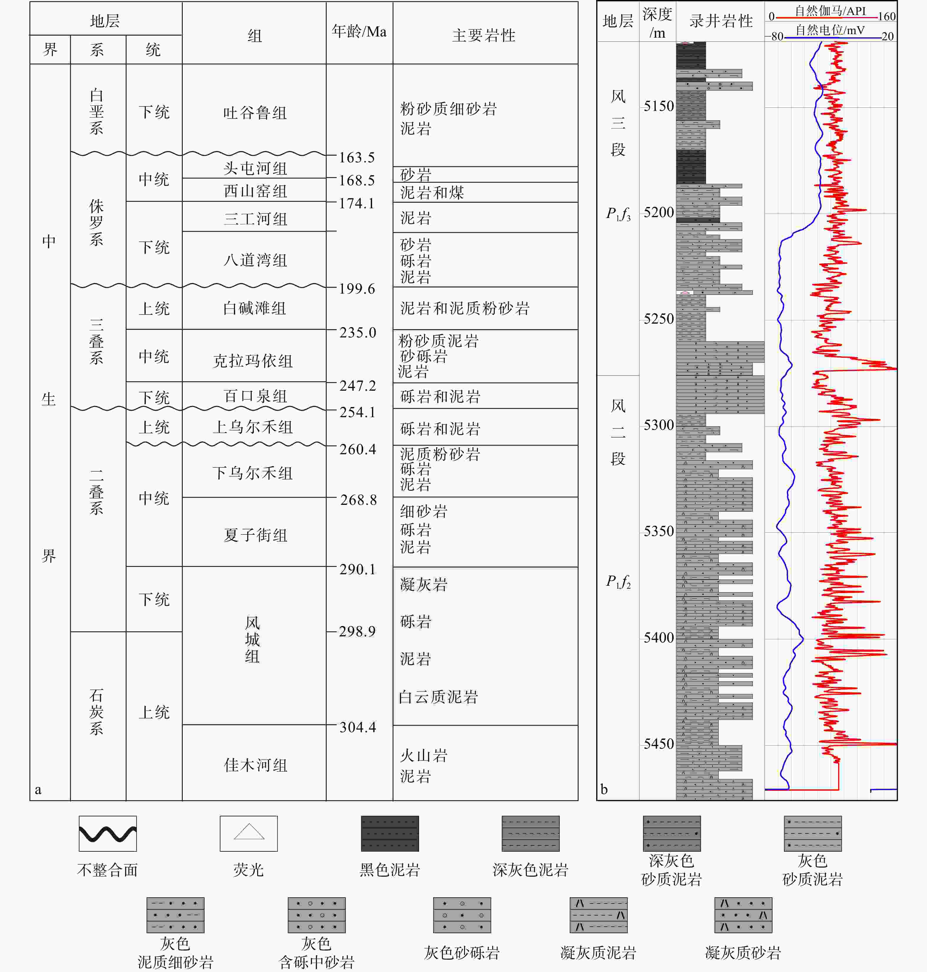a—准噶尔盆地玛湖凹陷综合地层柱状图(Dang et al.,2024);b—MH6井地层柱状图