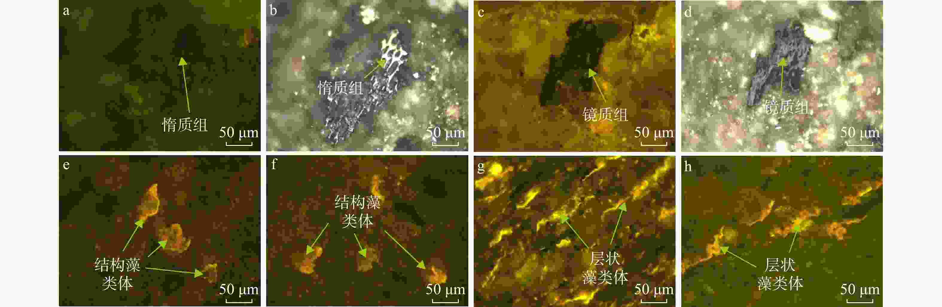 a—荧光下的惰质组; b—反射光下的惰质组(显示细胞结构,与图a同视域); c—荧光下的镜质组; d—反射光下的镜质组(与图c同视域);e—荧光下的结构藻类体(黄色荧光);f—荧光下的结构藻类体;g—荧光下的层状藻类体;h—荧光下的层状藻类体