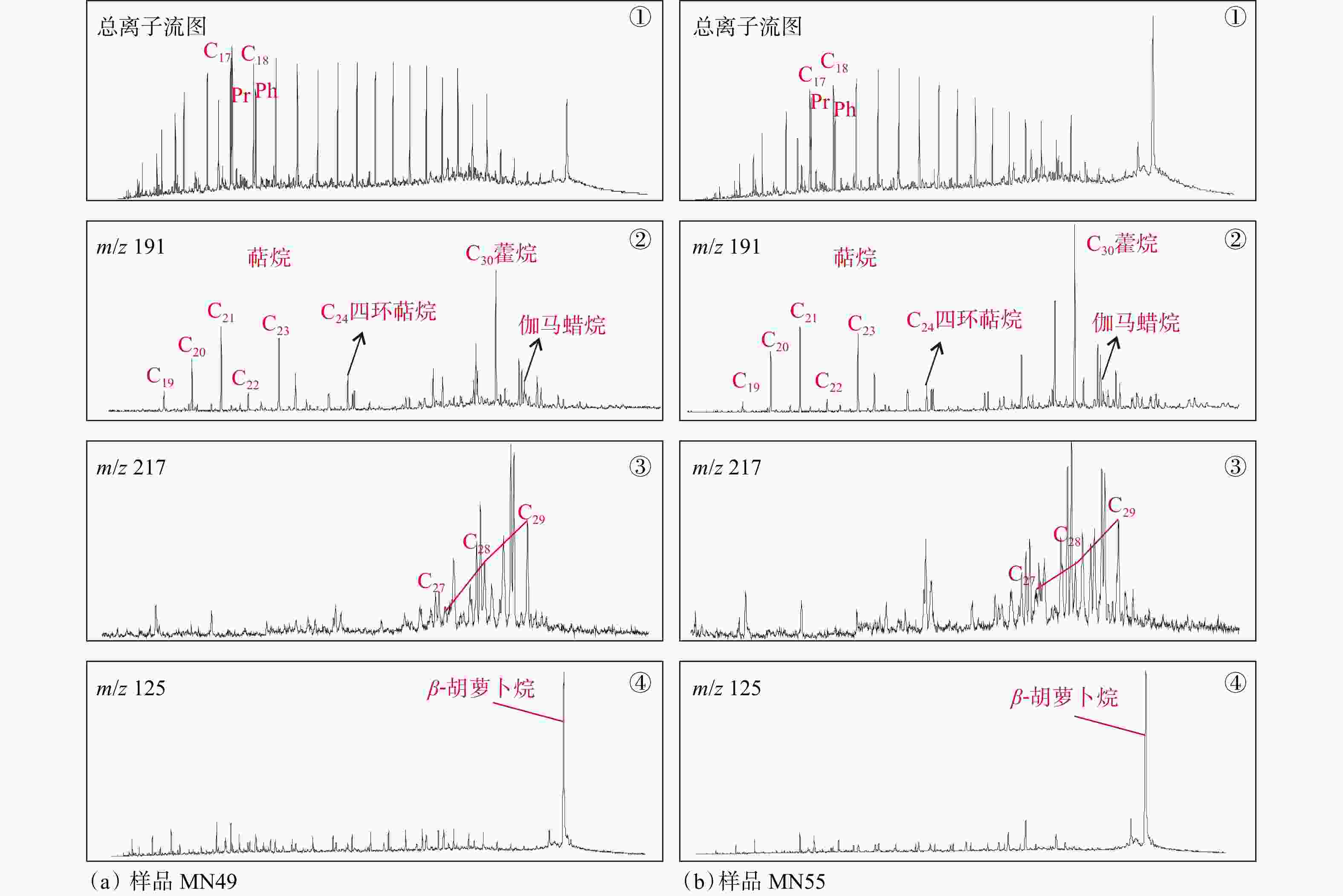 样品编号 井号 深度/m Pr/Ph Pr/n-C17 Ph/n-C18 CPI12-20 CPI24-34 n-C17/(n-C23+n-C25+n-C27) TAR Paq β-胡萝卜烷/n-Cmax ACL MN49 MH2 5135.3 1.25 1.18 1.23 1.08 0.99 0.64 0.33 0.71 1.95 26.36 MN50 MH2 5138.3 1.30 1.10 1.20 1.10 1.02 0.57 0.34 0.72 1.32 26.34 MN84 MH6 5262.5 0.77 1.01 0.93 1.06 1.05 0.74 0.24 0.76 0.05 26.07 MN90 MH7 4628.3 0.97 1.43 1.37 1.08 1.03 0.25 0.67 0.79 1.78 26.08 MN92 MH7 4625.7 0.84 1.22 1.30 1.07 1.09 0.20 0.91 0.73 2.06 26.28 MN8 MH9 4495.6 0.95 1.57 1.22 1.10 1.13 0.55 0.38 0.74 5.10 26.07 MN9 MH9 4500.1 0.83 2.63 1.95 1.16 1.25 0.33 0.60 0.71 8.95 26.38 MN12 MH9 4531.8 0.87 2.09 1.60 1.13 1.15 0.36 0.75 0.65 6.81 26.70 MN13 MH9 4538.9 0.93 0.87 0.73 1.07 1.13 0.32 0.92 0.59 9.66 27.04 MN14 MH9 4543.8 0.81 0.70 0.59 1.07 1.13 0.32 0.92 0.59 5.36 27.04 MN131 MH9 4570.0 0.77 1.19 0.89 1.07 1.13 0.32 0.92 0.59 3.20 27.04 MN19 MH9 4578.7 0.67 1.01 0.68 1.14 0.92 0.45 0.35 0.77 2.71 26.05 MN25 MH12 5043.0 1.02 1.17 0.97 1.14 0.92 0.45 0.35 0.77 2.38 26.05 MN26 MH12 5044.0 1.03 1.15 1.01 1.08 1.16 0.70 0.33 0.66 5.34 26.58 MN29 MH15 4853.5 0.51 1.61 0.93 1.08 1.16 0.70 0.33 0.66 5.33 26.58 MN32 MH15 4863.7 0.87 1.01 0.87 1.02 1.05 0.39 0.48 0.76 2.18 26.02 MN35 MH15 4880.4 0.75 1.14 0.87 1.04 1.05 0.38 0.53 0.74 1.79 26.15 MN37 MH15 4947.7 1.50 0.99 1.35 1.08 1.12 0.35 0.81 0.61 0.92 26.78 MN42 MH16 4305.5 1.62 0.83 1.23 1.07 1.14 0.51 0.37 0.74 0.82 26.16 MN53 MH20 5306.1 1.08 1.38 1.20 1.08 0.96 0.94 0.16 0.78 0.50 25.92 MN54 MH23 5007.5 1.06 2.62 2.26 1.07 1.13 0.48 0.60 0.64 0.53 26.72 MN55 MH23 5008.5 1.11 0.90 1.00 1.02 1.08 0.38 0.54 0.72 1.99 26.25 MN63 MH24 4858.3 0.72 2.01 1.49 1.05 1.05 0.38 0.55 0.74 1.47 26.27 MN64 MH26 4245.3 1.30 1.03 1.16 1.08 1.09 0.32 0.61 0.74 0.10 26.22 MN68 MH26 4266.0 0.94 1.66 1.28 1.11 1.20 0.89 0.36 0.62 4.09 26.84 MN70 MH26 4269.3 1.23 3.86 3.25 1.23 1.26 0.65 0.31 0.76 0.82 26.09 MN71 MH26 4319.7 1.14 0.95 1.13 1.01 1.08 0.31 0.47 0.79 0.88 25.78 MN72 MH26 4323.5 1.02 1.82 1.84 1.06 1.17 0.38 0.65 0.66 11.14 26.52 MN85 MH27 4838.3 0.77 1.01 0.93 1.05 1.08 0.75 0.22 0.79 1.79 25.98 MN88 MH27 4933.3 0.57 0.45 0.34 1.00 1.01 0.25 0.70 0.74 0.69 26.25 MN89 MH27 4937.0 1.00 0.76 0.53 1.09 1.10 2.36 0.09 0.74 0.09 26.29 MN95 MH29 4847.9 0.86 1.77 1.37 1.07 1.09 0.42 0.53 0.70 2.89 26.46 MN97 MH29 4852.8 0.98 1.25 1.10 1.04 1.02 0.47 0.43 0.72 2.67 26.33 CPI12-20—短链正构烷烃的碳优势指数;CPI21-34—中长链正构烷烃的碳优势指数;TAR—陆源高等植物/水生藻类或浮游生物比值;Paq—沉水/浮叶大型植物含量比;ACL—正构烷烃平均链长 表 3 玛南地区泥页岩萜烷、藿烷和甾烷生物标志物参数