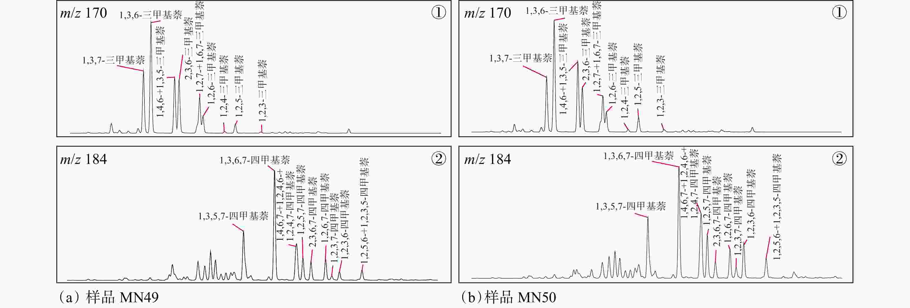 (20S+20R)C27/% C28/% C29/% MN49 MH2 5135.3 0.19 0.18 0.50 1.33 0.15 0.28 7.24 1.34 0.66 0.09 0.34 0.54 0.49 13 42 46 MN50 MH2 5138.3 0.40 0.22 0.53 1.21 0.08 0.15 5.50 0.82 0.20 0.08 0.40 0.55 0.51 11 42 47 MN84 MH6 5262.5 0.33 0.20 0.49 1.26 0.18 0.40 6.32 0.20 0.41 0.16 0.21 0.56 0.52 13 49 38 MN90 MH7 4628.3 0.12 0.20 0.50 1.22 0.33 0.63 20.19 0.20 0.50 0.04 0.26 0.55 0.48 9 41 50 MN92 MH7 4625.7 0.09 0.21 0.50 1.13 0.27 0.54 20.74 0.18 0.51 0.05 0.28 0.55 0.49 10 42 48 MN8 MH9 4495.6 0.17 0.17 0.48 1.21 0.46 0.85 4.04 0.10 0.57 0.07 0.19 0.42 0.45 13 37 50 MN9 MH9 4500.1 0.16 0.22 0.46 1.24 0.61 0.98 14.63 0.27 0.56 0.05 0.23 0.41 0.47 22 34 44 MN12 MH9 4531.8 0.11 0.19 0.50 1.50 0.36 0.57 7.81 0.15 0.54 0.04 0.27 0.46 0.47 9 39 52 MN13 MH9 4538.9 0.14 0.17 0.48 1.44 0.47 0.67 7.29 0.07 0.54 0.06 0.19 0.44 0.46 17 37 46 MN14 MH9 4543.8 0.14 0.20 0.51 1.39 0.46 0.72 6.89 0.10 0.54 0.04 0.22 0.48 0.47 12 39 48 MN131 MH9 4570.0 0.15 0.25 0.46 1.03 0.47 0.94 5.85 0.18 0.55 0.05 0.25 0.50 0.47 8 40 52 MN19 MH9 4578.7 0.13 0.26 0.42 1.01 0.23 0.50 14.20 0.18 0.47 0.06 0.32 0.55 0.50 10 43 47 MN25 MH12 5043.0 0.13 0.19 0.60 1.25 0.17 0.28 4.58 0.38 0.48 0.11 0.29 0.55 0.49 17 34 49 MN26 MH12 5044.0 0.09 0.20 0.64 1.31 0.17 0.28 4.29 0.37 0.46 0.10 0.30 0.54 0.52 17 34 49 MN29 MH15 4853.5 0.12 0.25 0.48 1.04 0.35 0.62 16.04 0.21 0.50 0.05 0.23 0.54 0.49 11 43 46 MN32 MH15 4863.7 0.10 0.20 0.44 0.96 0.26 0.62 18.16 0.19 0.51 0.05 0.36 0.55 0.48 12 41 47 MN35 MH15 4880.4 0.10 0.21 0.43 1.06 0.26 0.59 23.54 0.22 0.49 0.04 0.20 0.56 0.49 12 42 47 MN37 MH15 4947.7 0.22 0.21 0.41 1.08 0.47 1.10 1.37 0.21 0.54 0.05 0.39 0.54 0.51 13 34 53 MN42 MH16 4305.5 0.10 0.16 0.46 1.19 0.38 0.76 1.72 0.08 0.56 0.05 0.18 0.43 0.40 12 36 52 MN53 MH20 5306.1 0.39 0.22 0.53 1.27 0.09 0.18 12.93 0.63 0.14 0.12 0.25 0.55 0.50 10 43 47 MN54 MH23 5007.5 0.33 0.22 0.46 1.27 2.18 3.65 1.12 0.43 0.56 0.02 0.34 0.54 0.48 7 35 58 MN55 MH23 5008.5 0.14 0.21 0.49 1.39 0.34 0.57 5.05 0.11 0.52 0.06 0.37 0.53 0.48 18 37 44 MN63 MH24 4858.3 0.16 0.20 0.51 1.11 0.17 0.35 10.07 0.53 0.26 0.07 0.36 0.56 0.49 9 40 51 MN64 MH26 4245.3 0.25 0.20 0.44 1.21 1.11 2.45 2.30 0.17 0.57 0.03 0.37 0.39 0.45 5 39 56 MN68 MH26 4266.0 0.15 0.18 0.45 1.23 0.33 0.75 12.30 0.19 0.53 0.06 0.31 0.39 0.46 9 40 51 MN70 MH26 4269.3 0.31 0.27 0.47 1.07 1.35 3.13 0.64 0.20 0.57 0.03 0.37 0.46 0.47 5 33 61 MN71 MH26 4319.7 0.10 0.18 0.42 1.07 0.32 0.66 0.74 0.08 0.56 0.03 0.26 0.46 0.46 6 33 61 MN72 MH26 4323.5 0.11 0.21 0.50 1.26 0.31 0.57 0.88 0.07 0.56 0.04 0.33 0.39 0.46 11 47 42 MN85 MH27 4838.3 0.17 0.21 0.53 1.21 0.32 0.59 0.95 0.30 0.51 0.05 0.30 0.55 0.49 9 40 51 MN88 MH27 4933.3 0.09 0.26 0.56 1.02 0.25 0.46 0.84 0.14 0.49 0.04 0.24 0.55 0.49 16 39 45 MN89 MH27 4937.0 0.26 0.16 0.41 0.92 0.17 0.57 0.89 0.30 0.44 0.22 0.34 0.53 0.50 10 45 44 MN95 MH29 4847.9 0.11 0.19 0.50 1.02 0.18 0.39 0.96 0.29 0.40 0.05 0.31 0.56 0.49 9 42 49 MN97 MH29 4852.8 0.14 0.18 0.53 0.99 0.12 0.25 0.97 0.24 0.37 0.08 0.31 0.56 0.50 9 43 48 TT—三环萜烷;Tet—四环萜烷;ETR—扩展三环萜烷比值 表 4 玛南地区泥页岩芳香烃生物标志物参数与碳同位素测试结果