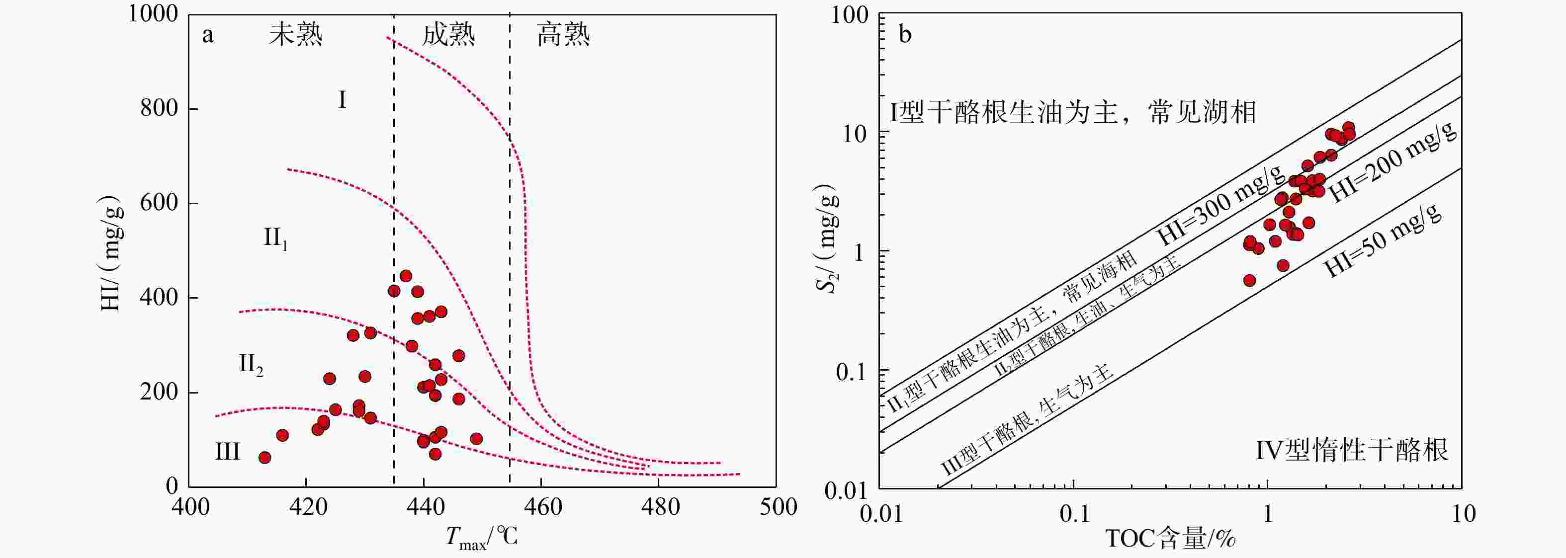 Figure 6. Comprehensive identification chart for assessing organic abundance and maturity of mud shales from the southern Mahu Sag, Junggar Basin