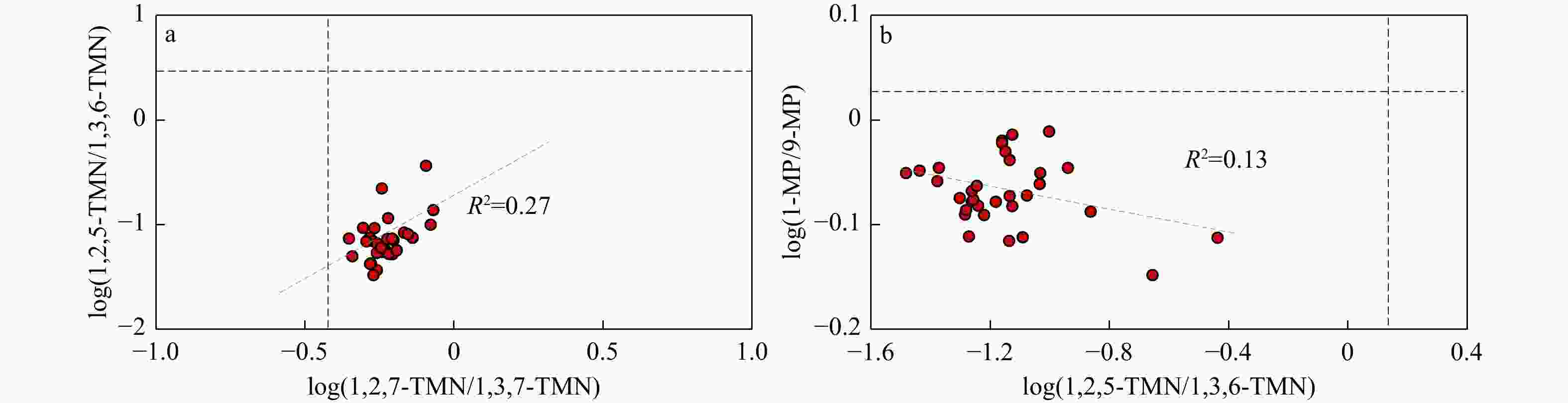 a—log(1,2,5-TMN/1,3,6-TMN)与Log(1,2,7-TMN/1,3,7-TMN)交汇图;b—log(1,2,5-TMN/1,3,6-TMN)与log(1-MP/9-MP)交汇图(Budzinski et al.,1995)