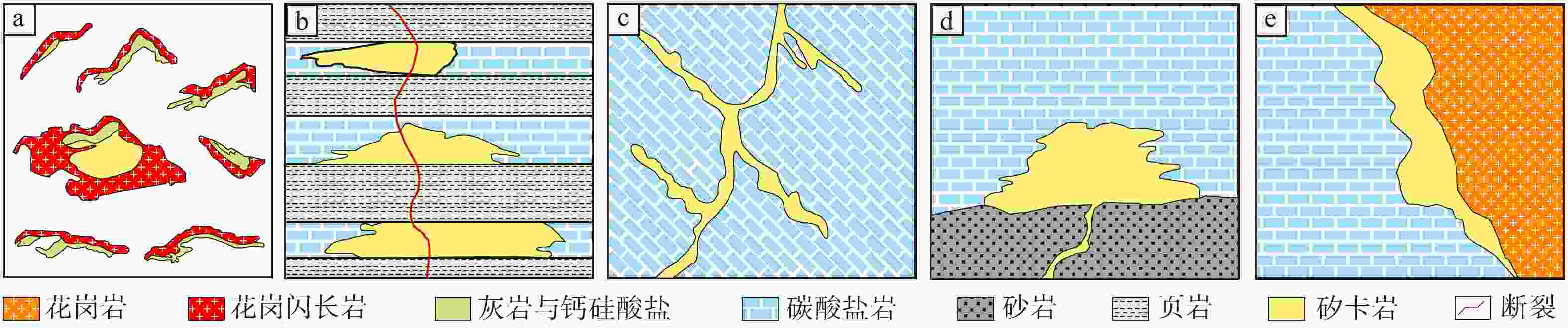 a—美国加利福尼亚州内华达山脉深成岩接触带与矽卡岩体的关系;b—碳酸盐岩夹层层间交代矽卡岩构造控矿样式;c—碳酸盐岩顺层交代矽卡岩构造控矿样式;d—碳酸盐岩与砂岩Si-Ca界面矽卡岩构造控矿样式;e—花岗岩接触带矽卡岩构造控矿样式(据Kwak,1987修改)