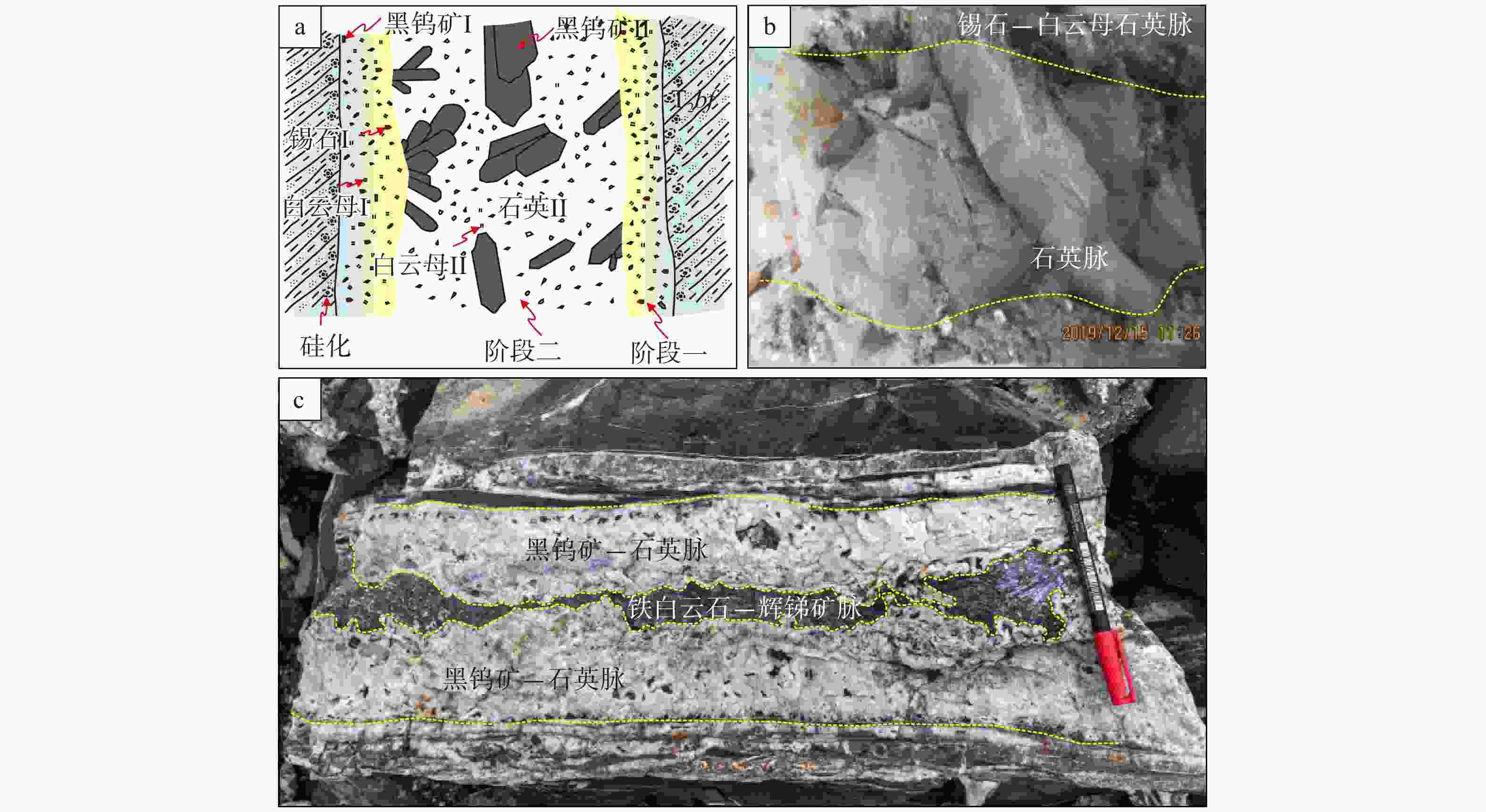 a—广西平那钨锡矿床锡石−白云母−石英脉;b—广西平那钨锡矿床石英−黑钨矿脉与锡石−白云母−石英脉产于同−含矿构造空间;c—广西大厂矿田黑钨矿−石英脉与辉锑矿−铁白云石脉产于同一容矿裂隙