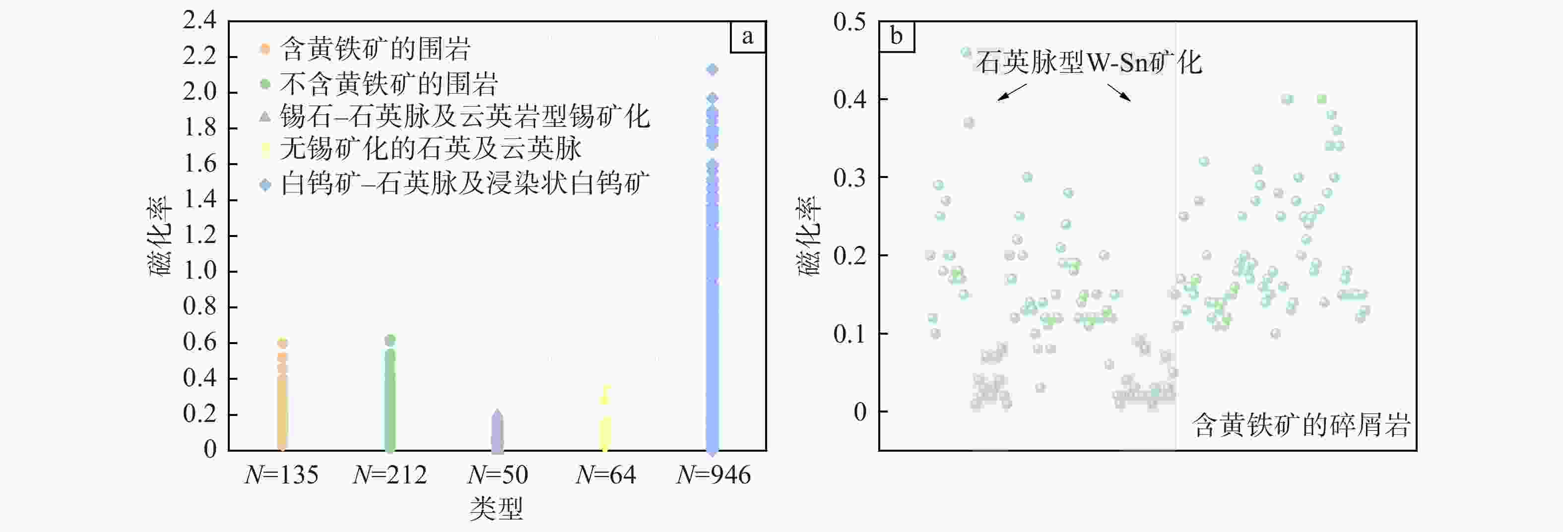图  13  广西百色平那钨−锡矿床不同地质体磁化率与石英脉型钨−锡矿脉关系