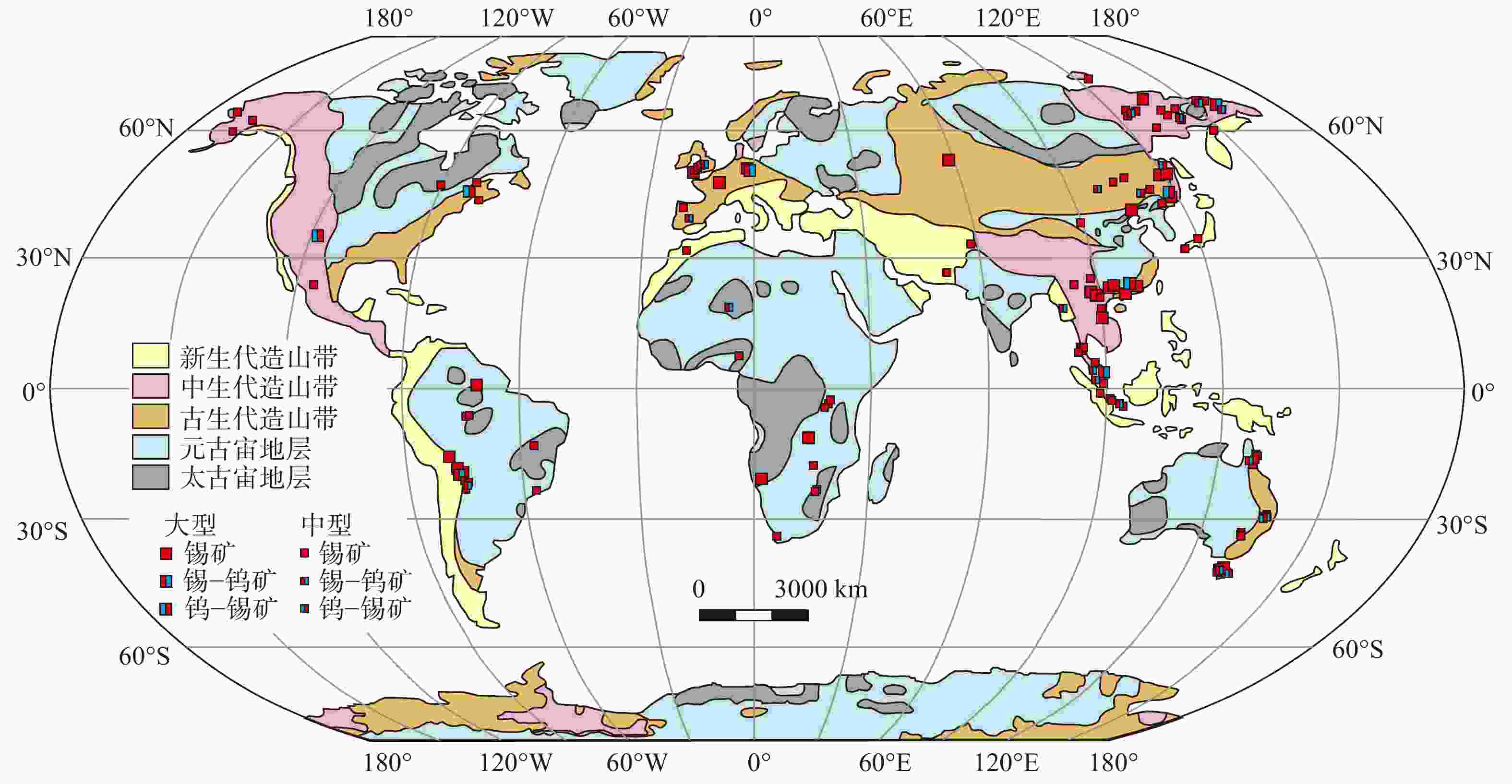 Figure  1.  Map showing the global distribution of tin and tungsten deposits (modified after Taylor, 1979; Yang et al., 2023)