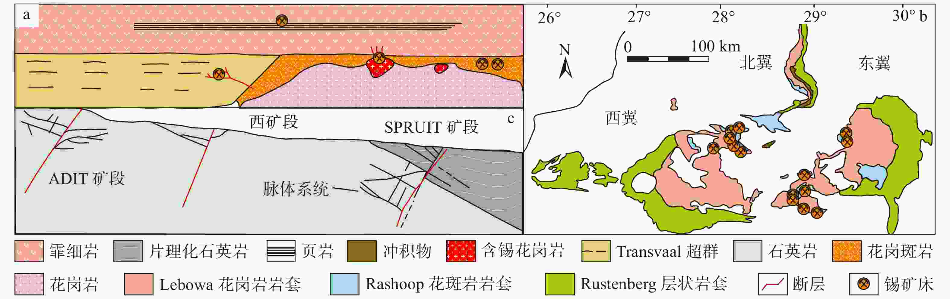 a—南非布什维尔德杂岩有关锡矿床构造模型; b—布什维尔德杂岩地质图; c—罗伊贝赫(Rooiberg)锡矿田莱乌波特(Leeupoort)地区矿化−地质剖面(据Vonopartis et al.,2020修改)