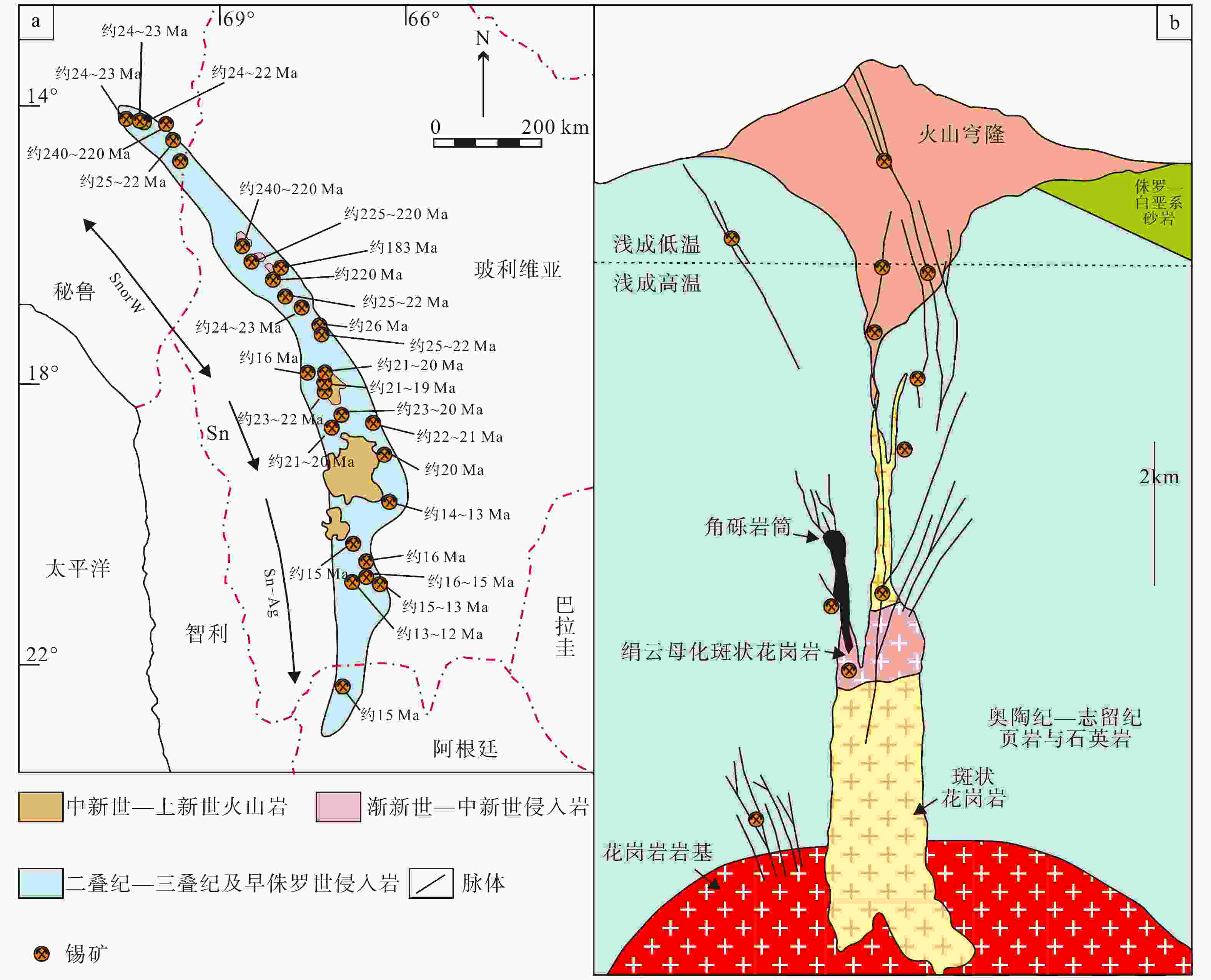 a—玻利维亚锡矿带主要矿床、岩体及火山沉积分布图;b—玻利维亚锡矿带火山−次火山成因浅成低温热液与异位高温热液矿床示意剖面模型(据Gemmrich et al.,2021修改)