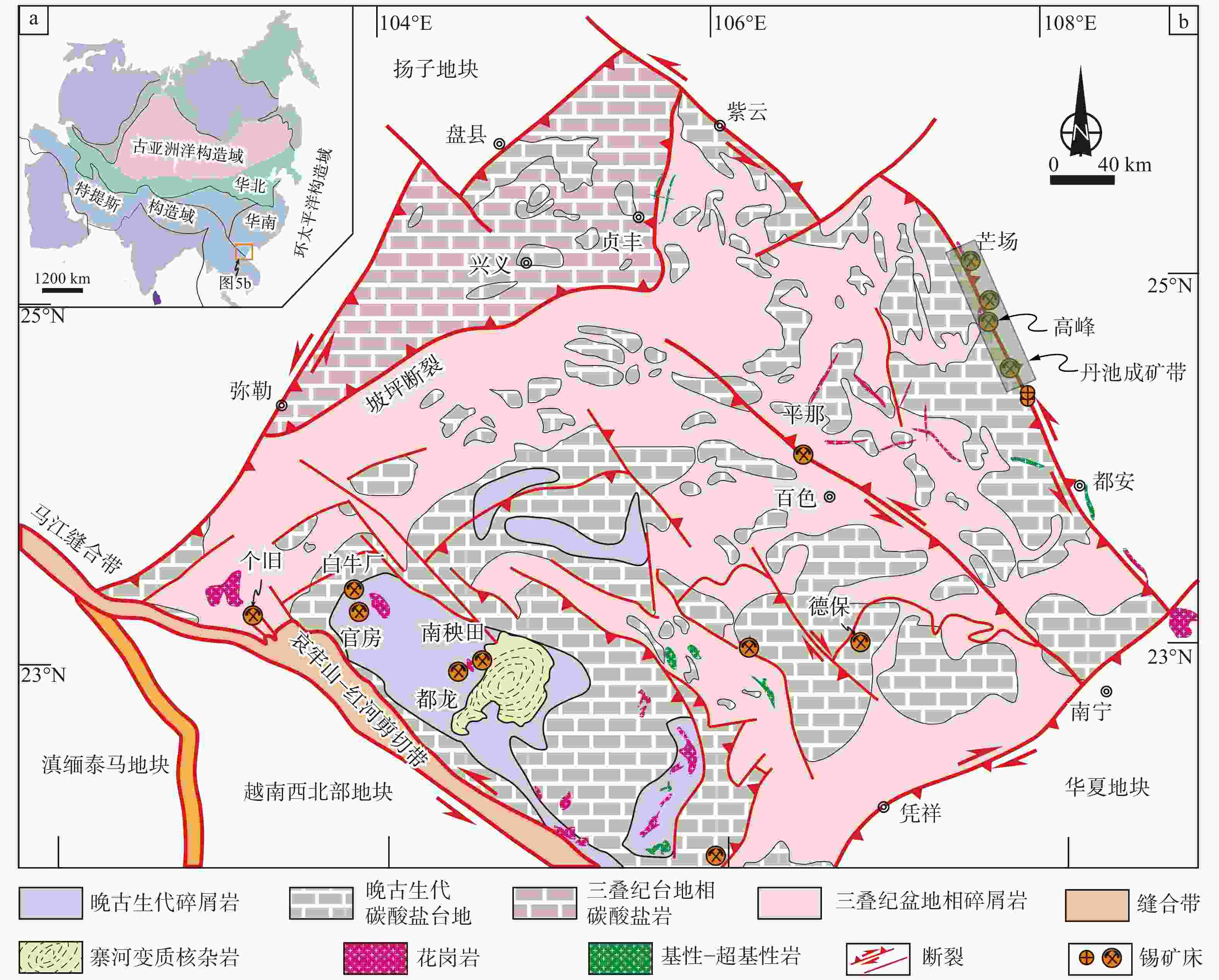 a—研究区大地构造位置图;b—南盘江−右江成矿带锡金多金属矿集区大地构造位置及锡多金属矿床分布图(Xiao et al., 2022