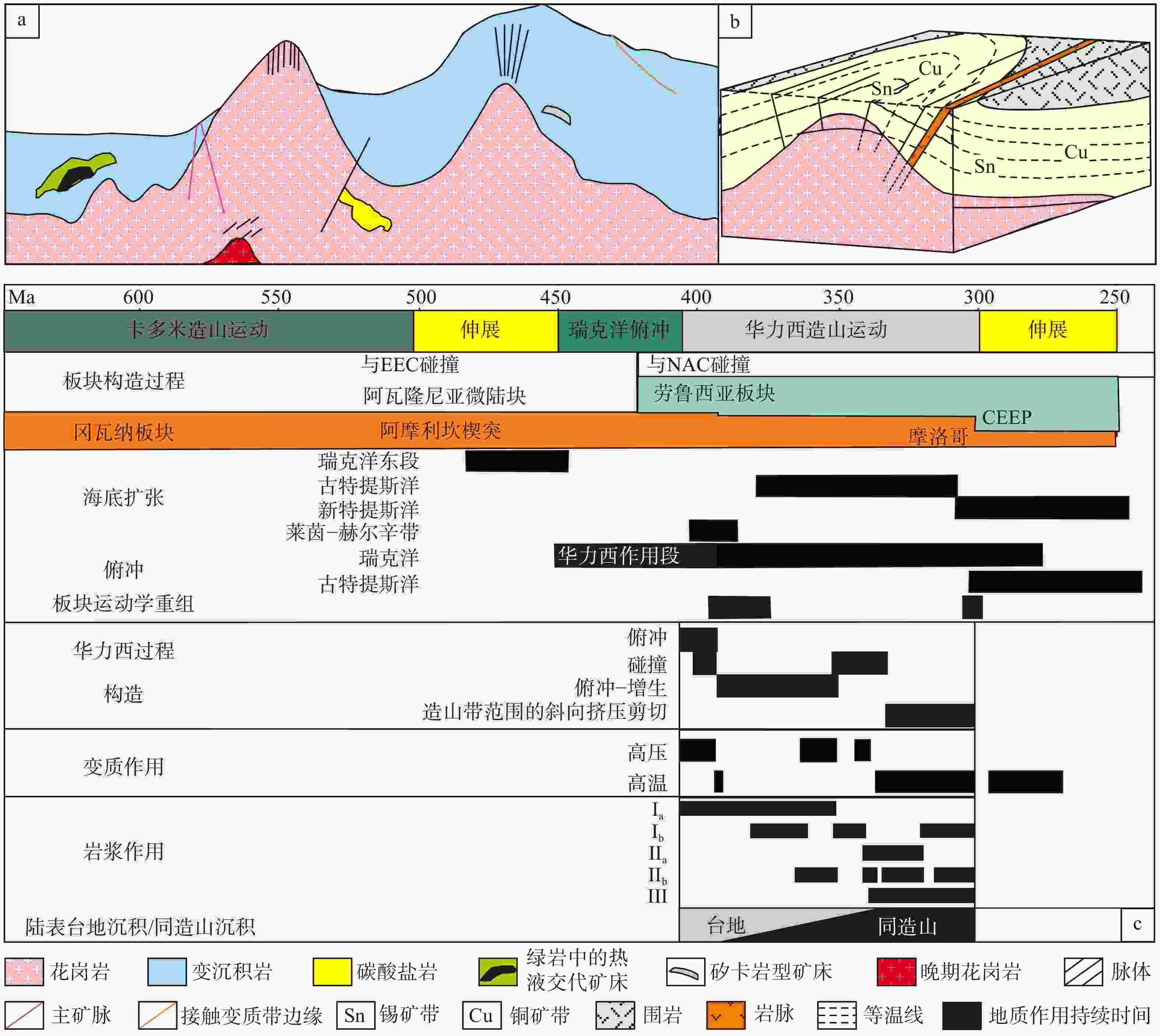 EEC—东欧克拉通;NAC—北美克拉通;CEEP—中欧伸展省a—英格兰西南部康沃尔地区原生锡矿床示意图;b—英格兰西南部康沃尔地区矿化分带示意图(据Taylor,1979修改);c—基于冈瓦纳大陆与劳伦大陆板块构造背景的欧洲与北非华力西造山运动时序框架(据Kroner and Romer.,2013修改)