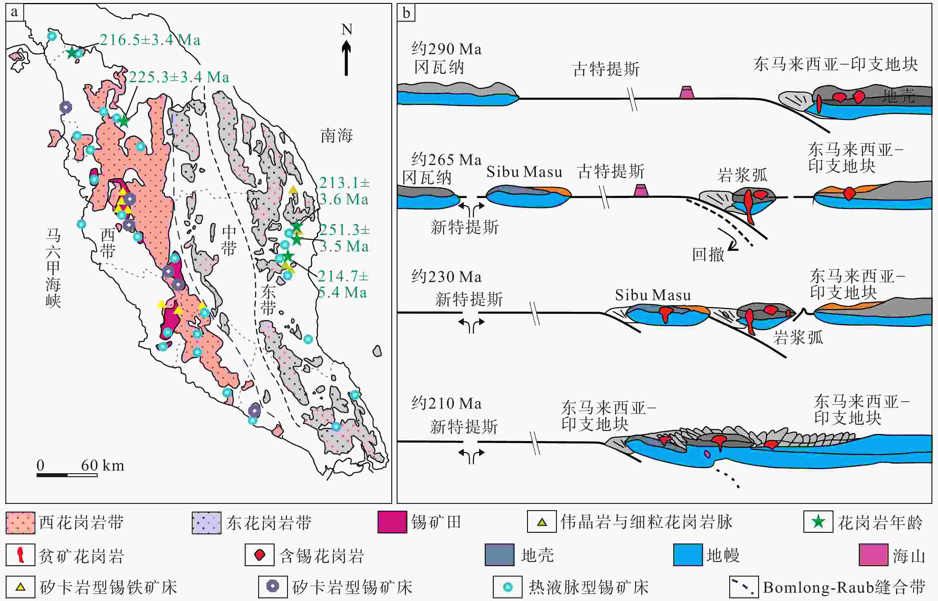 a—马来西亚半岛简化地质图及锡矿床与花岗岩分布特征;b—马来西亚半岛古特提斯洋演化过程的构造示意模型图(据Yang et al., 2020修改)