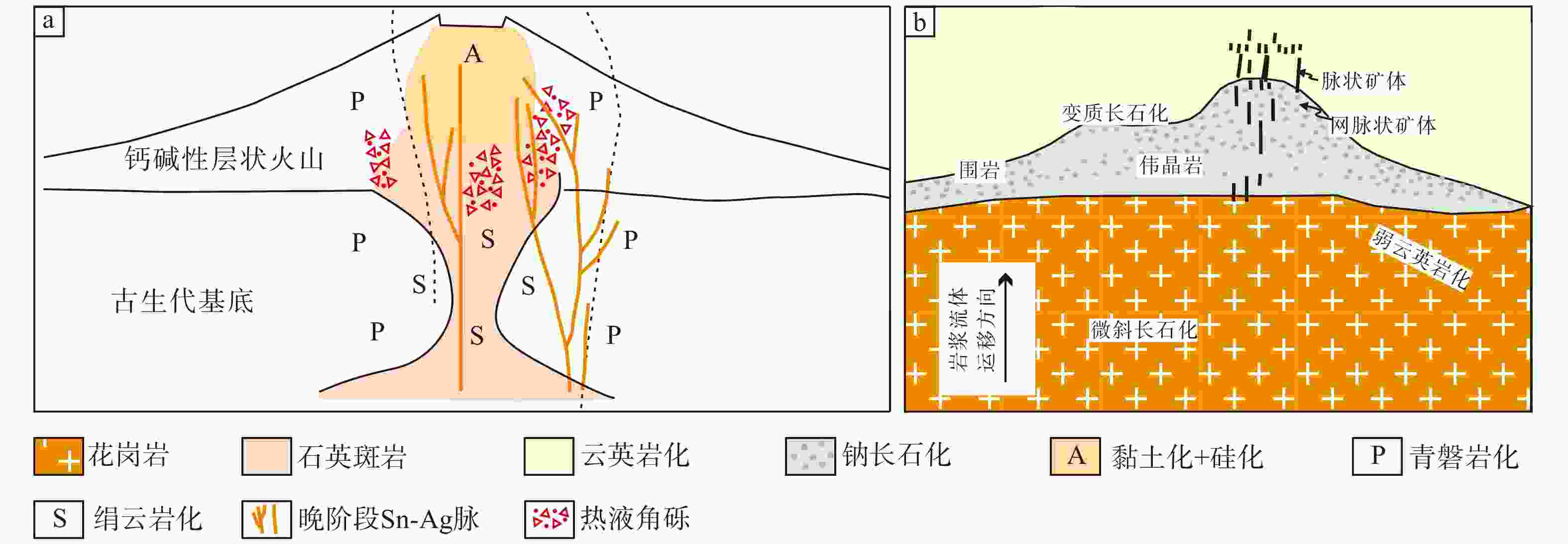 a—玻利维亚锡矿带斑岩型矿床构造蚀变系统(据Sillitoe et al.,1975修改);b—云英岩模型(据Pirajno,1992修改)