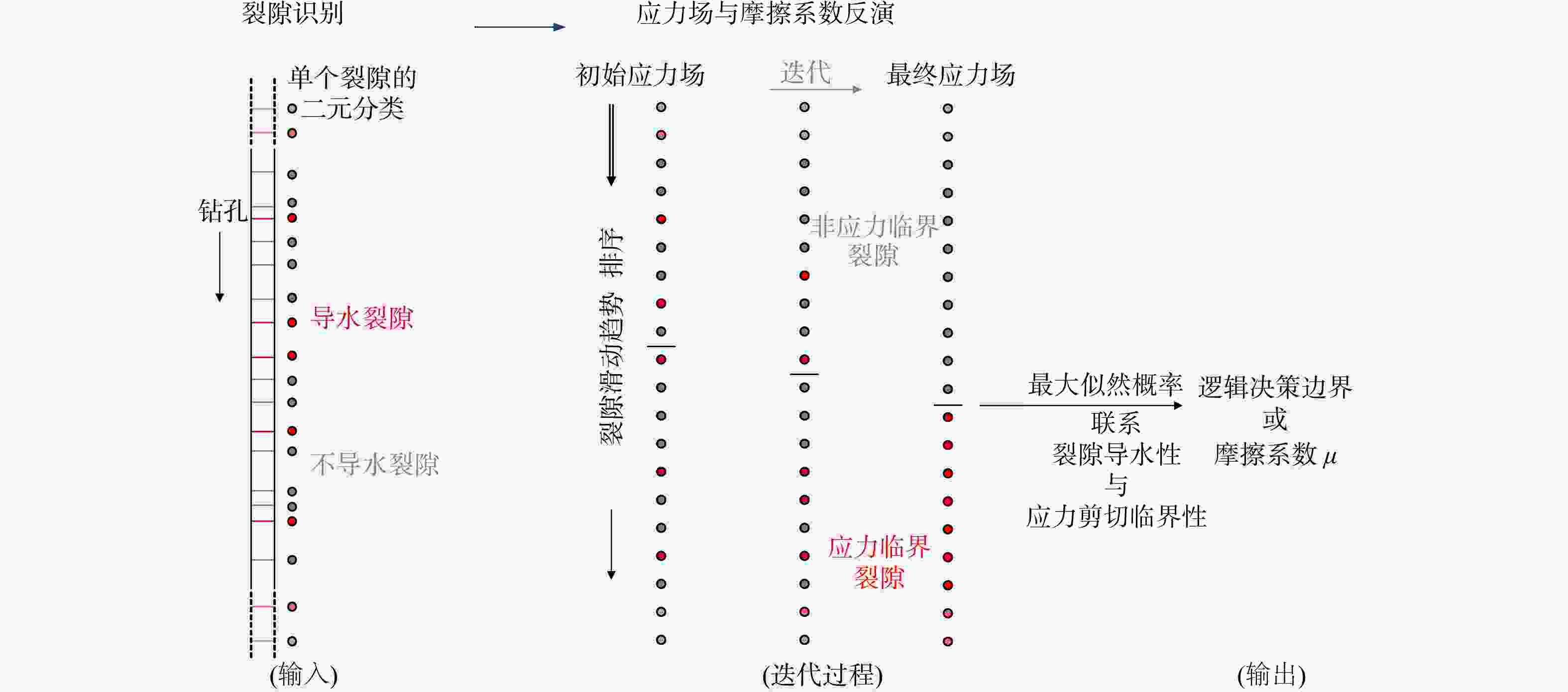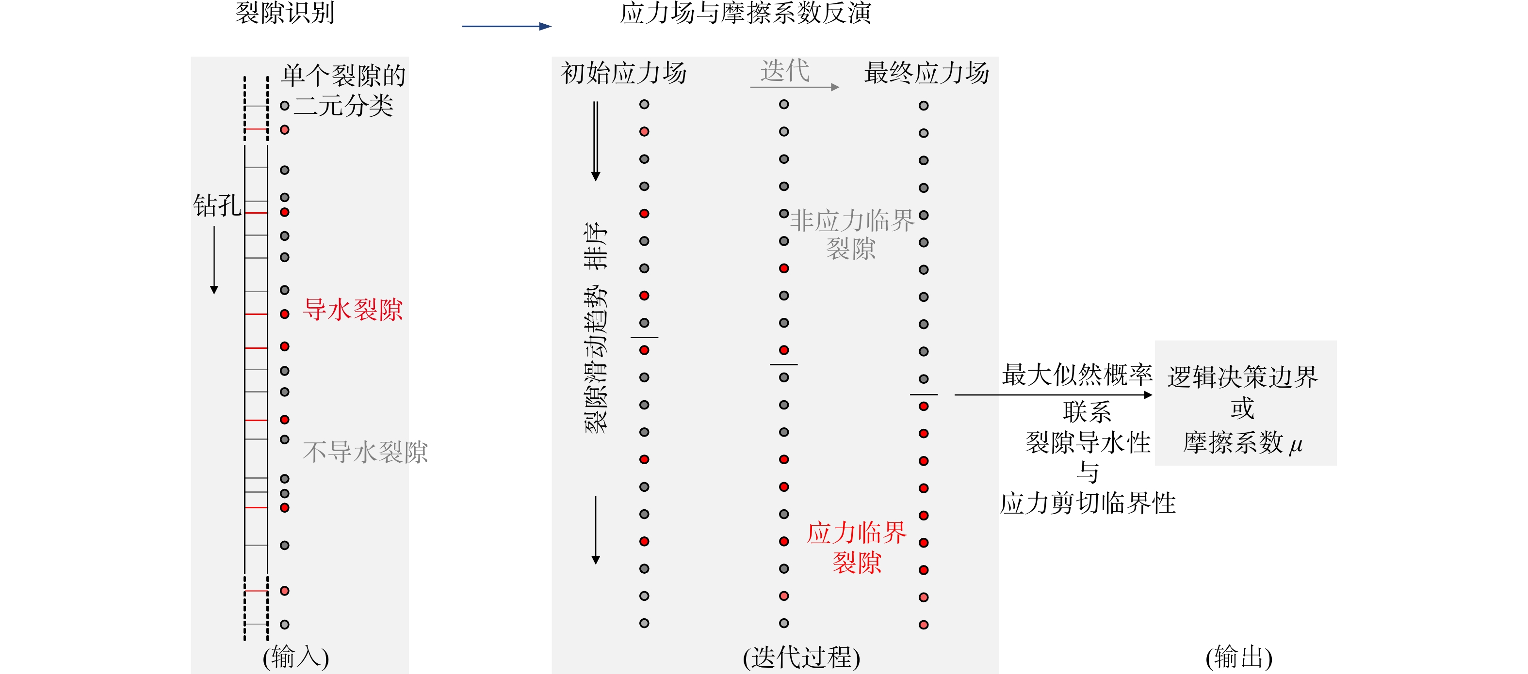 图 4 利用钻孔中天然裂隙导水性开展地壳应力场和岩体摩擦系数反演的示意图