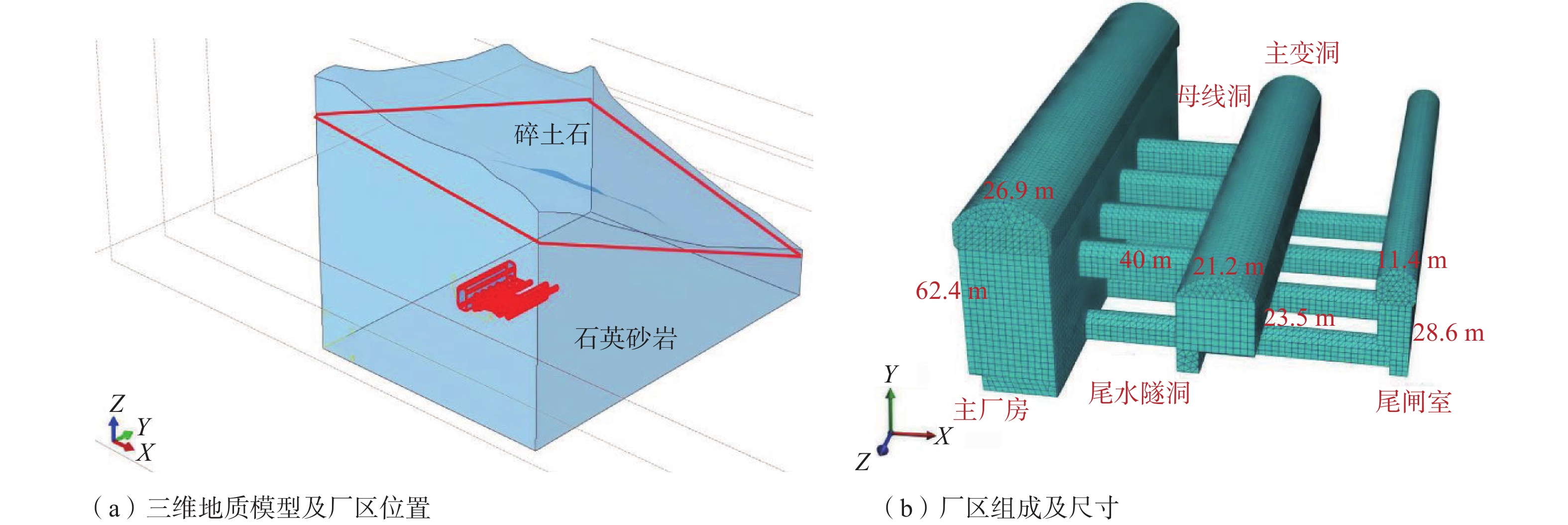 为查明新疆天山造山带南缘某大型深埋抽水蓄能电站地下硐室地应力场特征及围岩稳定性,保障地下厂房及引水隧洞地质安全。首先,在地下厂房内开展2组三维水压致裂法地应力测量,获取工程区域的地应力场基础数据;随后,建立工程区的三维地质模型,并利用有限元数值模拟方法反演该区域的三维地应力场;最终,结合三维应力场的分布特征,从地下硐室轴线布置的合理性和地下厂房及引水隧洞围岩的岩爆风险两个方面,综合评估抽水蓄能电站工程区地下硐室的稳定性。研究结果表明:抽蓄电站地下厂房三维地应力测量结果表明最大主应力(σ1)为16.19~16.23 MPa、方向为N43.98°E~N54.44°E、倾角为-4.81°~6.93°,中间主应力值(σ2)为9.82~12.23 MPa、方向近SE、倾角为-18.89°~-14.52°,最小主应力(σ3)为6.90~10.41 MPa、整体表现为近垂直;三维应力场反演地下厂房最大主应力值(σ1)为16.54~17.21 MPa、方位角为N47.88°E~N56.32°E,引水洞轴线最大主应力值(σ1)为14.86~24.32 MPa;地下厂房和引水隧洞轴线方向与实测最大水平主应力(SH)夹角均与SHV型应力场最优夹角(62.84°)偏差≤10°,有利于地下硐室稳定性;采用岩石强度应力比法、陶振宇等多准则判据分析地下厂房及引水隧洞围岩总体为轻微岩爆等级。研究结果为该抽蓄电站地下厂房和引水隧洞设计、施工建设提供科学依据,同时补充了新疆天山造山带南缘三维地应力实测数据的空白。