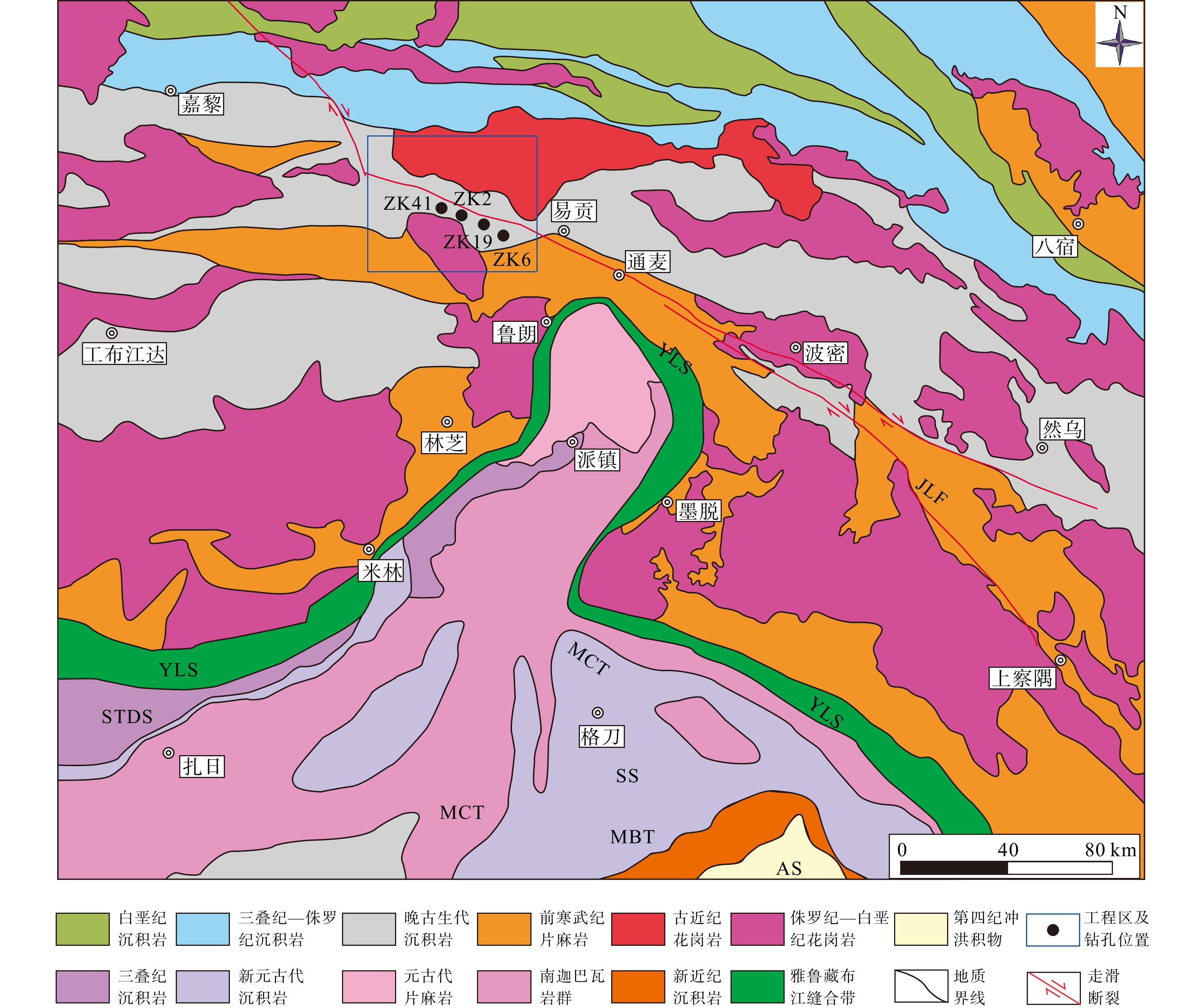 青藏高原东南缘的嘉黎断裂带是高原物质向南东挤出的关键边界构造,其几何展布与活动性对理解高原构造演化及评估区域工程风险至关重要。然而,该断裂带东南段(古乡至贡日嘎布段)因地形险峻、植被覆盖深厚,其精确空间位置与全新世活动性长期存在争议。本研究针对该关键争议区段,综合运用高分辨率遥感影像解译、野外地质地貌调查、钻探与槽探揭露及大地电磁测深等多种手段,系统研究了断裂的空间展布、结构特征及活动性。结果表明,嘉黎断裂带南支确切地沿古乡南、嘎隆拉、金珠弄巴至朗秋弄巴一线连续展布,遥感解译与野外调查识别出断层槽谷、断塞塘、挤压鼓包、基岩断层镜面与水平擦痕等断裂活动证据;地球物理探测揭示了清晰的低阻破碎带;钻探岩心揭露了显著的断层破碎带。这些证据共同证实了断裂在该区段的存在与展布。结合区域古地震研究,认为该段具备全新世活动潜力。研究进一步系统分析了断裂活动可能引发的深部工程效应,包括围岩劣化、同震错断、高地应力、地震动放大、突涌水、地温异常及洞口次生灾害等。在传统活动探测方法难以实施的复杂地质环境下,本研究针对青藏高原东南缘高地形起伏、深植被覆盖和缺乏细粒第四纪沉积等问题,重点实施了遥感解译、高精度物探和跨断裂钻探工作,为后续在类似地区开展活动断层探查和研究建立了成功示范,取得的成果不仅为完善青藏高原东南缘构造模型提供了关键地质约束,也为穿越该断裂带的重大工程(如川藏铁路)的规划、抗震设计与风险防控提供了不可或缺的科学依据。